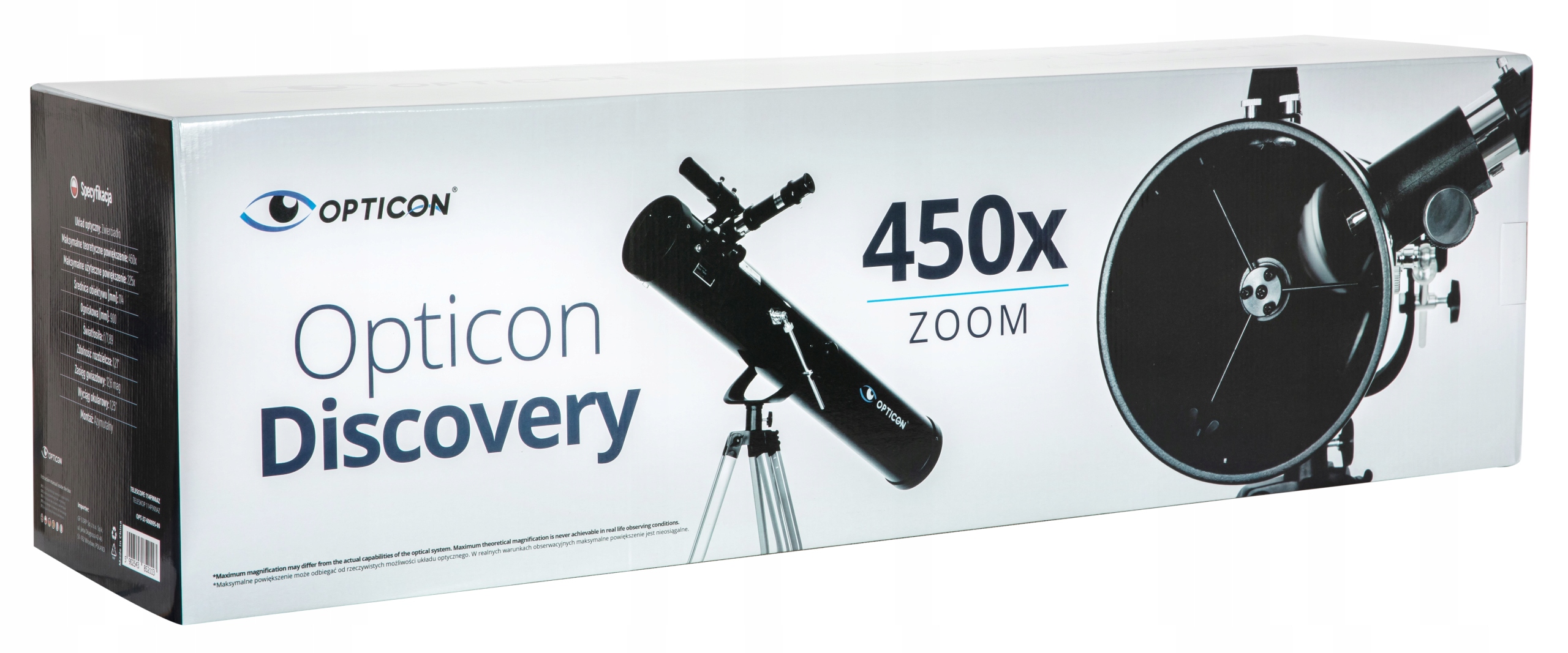 Телескоп Discovery оснащен тремя сменными окулярами и линзой Барлоу, которая удваивает диапазон доступных увеличений. Оптическая труба установлена на полноразмерном штативе с головкой АЗ, предназначенном для начинающих наблюдателей. Это позволяет чрезвычайно легко находить объекты в небе. Дополнительный прицел с крестовиной (искателем) облегчает точное прицеливание. После использования входящей в комплект выпрямляющей линзы телескоп может функционировать как телескоп для наблюдений за природой и ландшафтом (наблюдение за птицами, самолетами, отдаленными зданиями и т.п.).