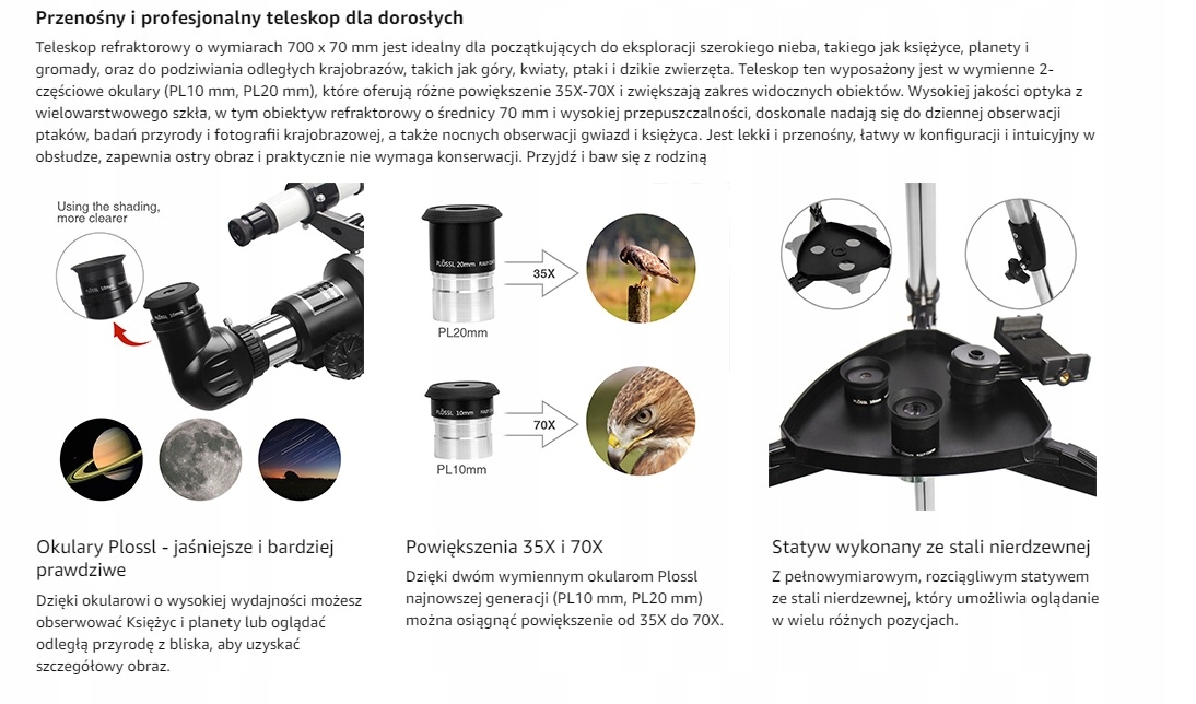 - ОТЛИЧНОЕ ОПТИЧЕСКОЕ КАЧЕСТВО - апертура 70 мм и фокусное расстояние 700 мм, телескоп оснащен окулярами Плессля 10 мм и 20 мм, 70-кратным и 35-кратным увеличением. Окуляры Plossl имеют лучшие оптические характеристики, чем окуляры K и H. Эффективно уменьшает хроматическую аберрацию и ореолы.