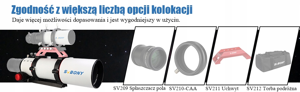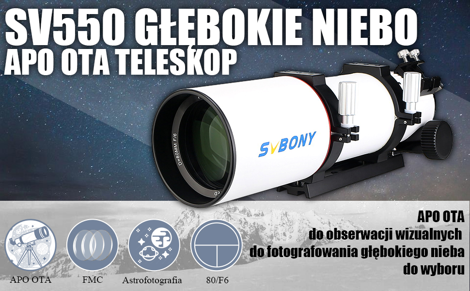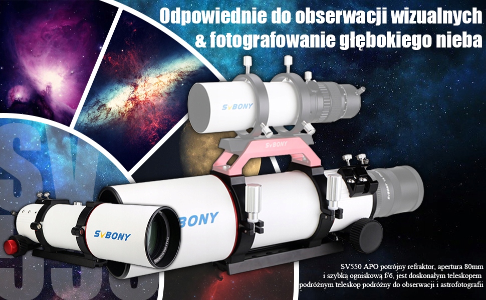 Тройной рефрактор SV550 APO с апертурой 80 мм, эффективным фокусным соотношением f/6 и тройной ахроматической оптикой ED с центральным звеном с многослойным покрытием представляет собой превосходный дорожный телескоп для наблюдений и астрофотографии.