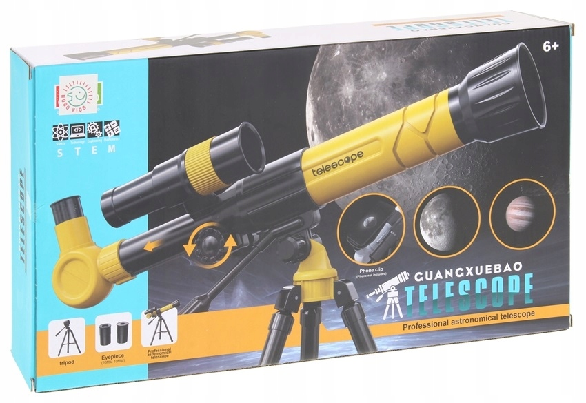 Фантастический астрономический телескоп с пластиковым штативом с возможностью 40, 30 и 20-кратного увеличения. Представленный набор имеет устойчивый штатив, который легко раскладывать, телескоп и окуляр с возможностью наблюдения за небесными светилами. Используемое наклонное зеркало значительно улучшает контрастность изображения и уменьшает оптические дефекты линз. В комплект входит подставка с присоской для телефона, которую следует прикрепить к окуляру и разместить телефон в соответствующем месте. Благодаря этому изображение появится на экране телефона. Это незаменимый инструмент для тех, кто также интересуется наблюдением за наземными объектами. Телескоп станет прекрасным подарком для маленьких любителей астрономии. Он доставит много радости и непременно поможет развить интерес к космосу, а астрономия станет самым большим увлечением вашего ребенка.