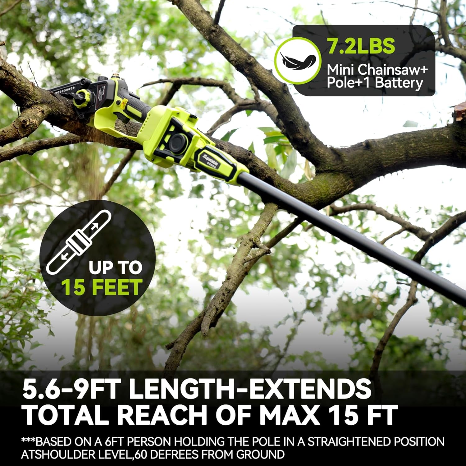 - [Безопасная и эффективная работа] Надежная бензопила 2-в-1 с питанием от аккумулятора обеспечивает безопасный и удобный способ обрезки ветвей. Может использоваться как автономная электрическая цепная пила для обрезки низко свисающих ветвей или как высоторезная пила, чтобы избежать опасности залезть на деревья и повысить эффективность работы.