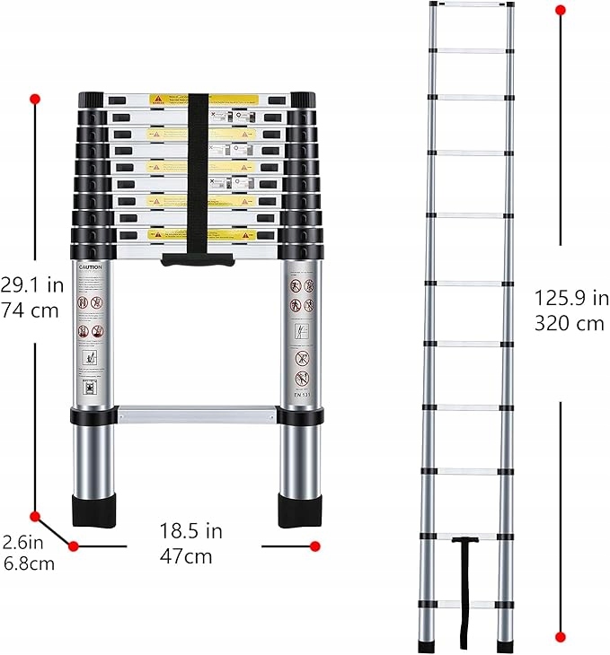- Телескопическая лестница 3,2 м: изготовлена из алюминия, удобного и долговечного, расстояние между 30 см градусов, ширина 4 -сантиметровых классов, гибкая, адаптированная к разным высотам, вес: 9 кг.