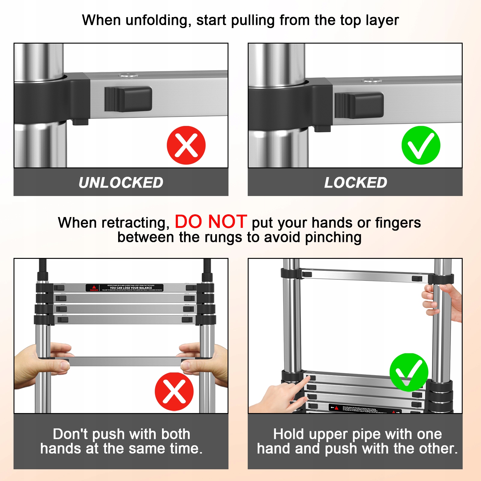 - ✅ne и долговечный: эта лестница имеет максимальную грузоподъемность 150 кг (330 фунтов), обеспечивая безопасное использование. Резиновые ноги и съемные крючки увеличивают стабильность телескопической лестницы, максимизируя безопасность. Его можно легко транспортировать одной рукой, удерживая ручку. (Примечание. Лестничный крючок не должен быть подвешен на трубах диаметром более 6 см.) Он идеально подходит для таких задач, как «Чистовые работы», «Очистки окна», «Очистка желобов», «покраска внутри и снаружи», общий ремонт, сохранение шкафов и техническое обслуживание. Если вам нужно выполнять много задач внутри и снаружи одновременно, эта практическая и надежная складная лестница, безусловно, является лучшим выбором; Попрощайтесь с неуклюжыми длинными лестницами и проблемами.