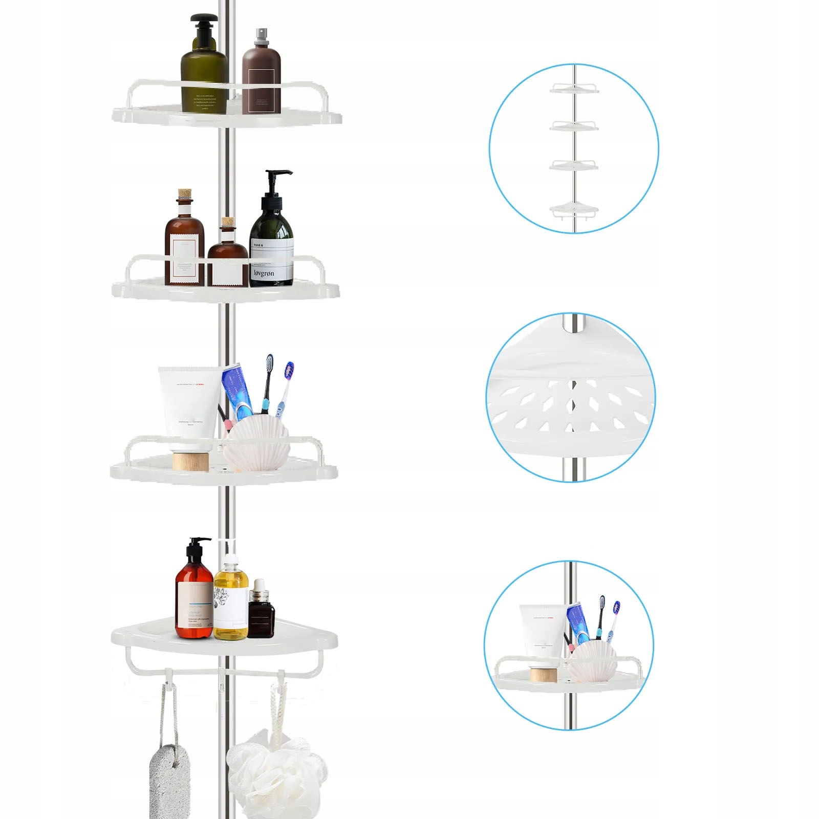 ✅ 4 уровней - стойка для ванной комнаты оснащена 4 полками с сливными отверстиями, которые могут быть независимо отрегулированы на разных высотах и вращаются вокруг оси закрепляющей палочки.