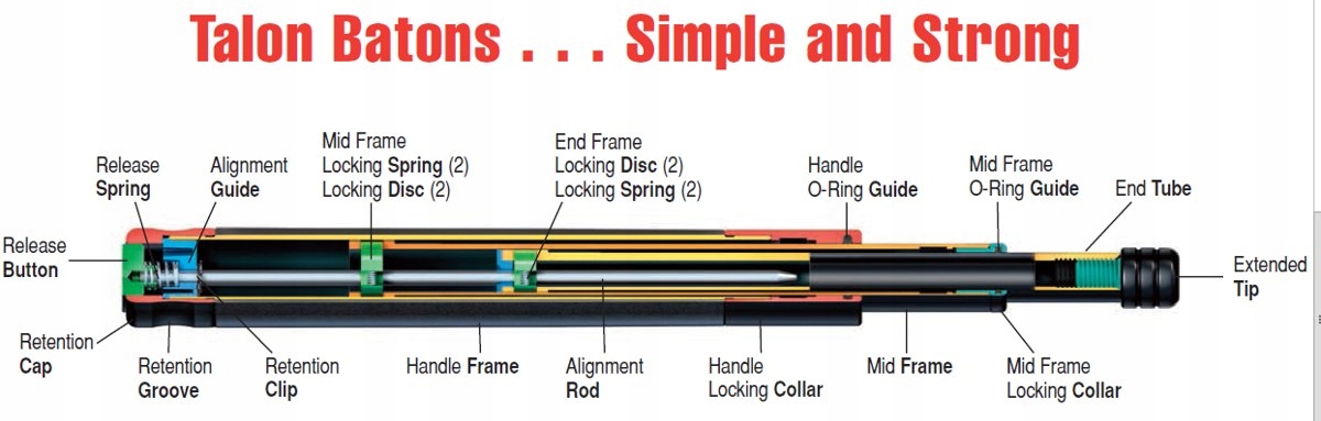 TALON - задает новые стандарты в области оборонных технологий. Классическая планка - Friction Loc - открывается энергичным движением запястья. Дубинка TALON можно открыть двумя способами, стандартно - раскачиванием - или разложить, потянув за конец штанги. Последний метод выгоден в ситуациях, когда нам нужна конфиденциальность (без шума) или когда обстоятельства не позволяют полностью развернуться. (давление, вокруг нет места). Дубинку TALON можно закрыть одной рукой — просто отпустите фиксатор DiscLoc, нажав кнопку освобождения (Button Release), расположенную на конце рукоять и упор кончика дубинки. Размещайте штангу на любой поверхности.