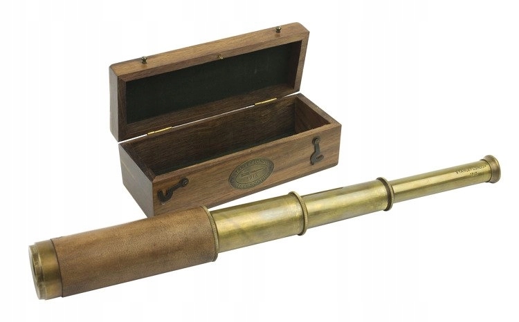Топия классического телескопического телескопа из латуни и натуральной кожи в деревянном ящике. Изделие художественного мастерства, стилизованное под антиквариат. Красивое внутреннее убранство с морской атмосферой. Идеальный подарок для настоящего морского волка.