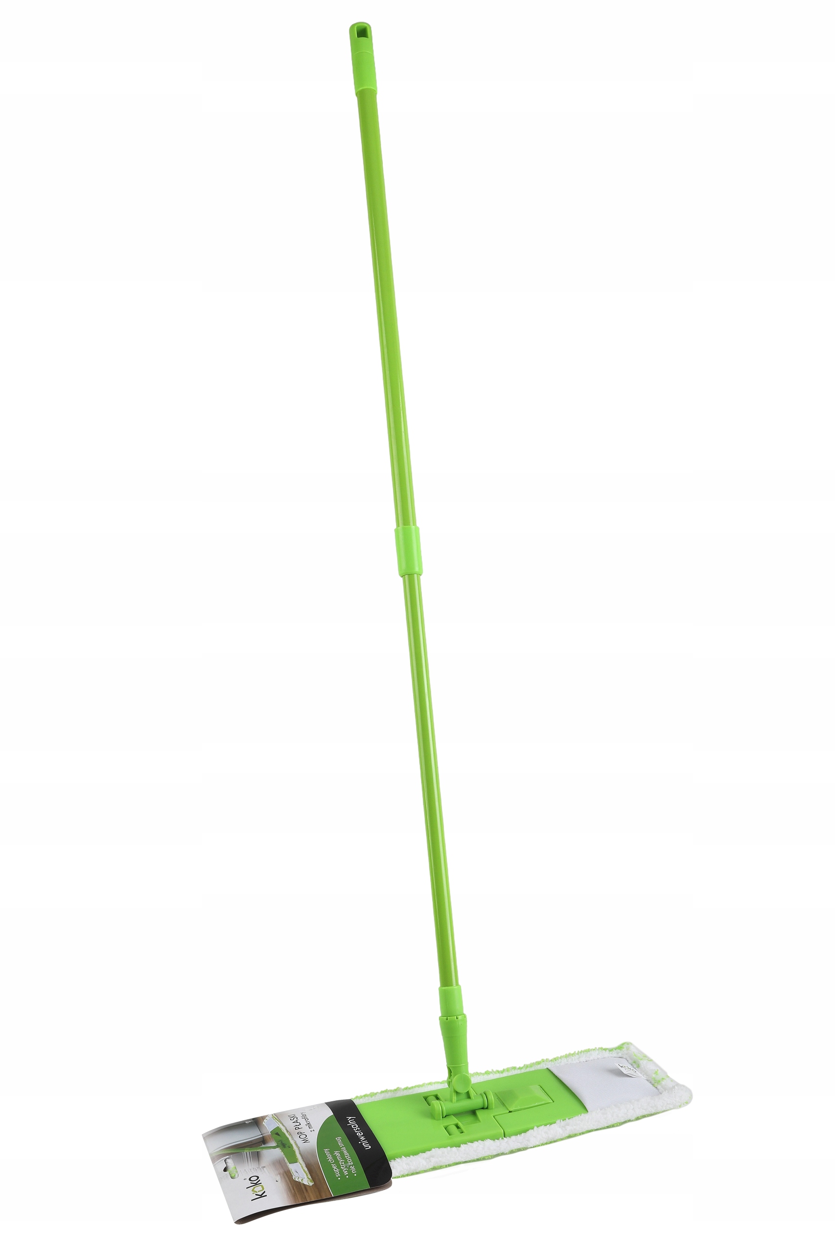 Набор с телескопической штангой, плоской рамкой и чехлом из микрофибры зеленого цвета. Рабочий диапазон палки от 73,5 см до 120 см. Идеально подходит для больших трапециевидных напольных поверхностей.