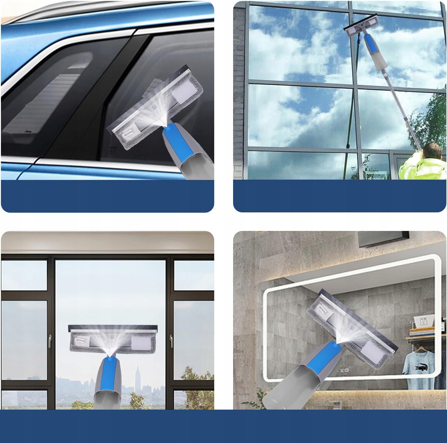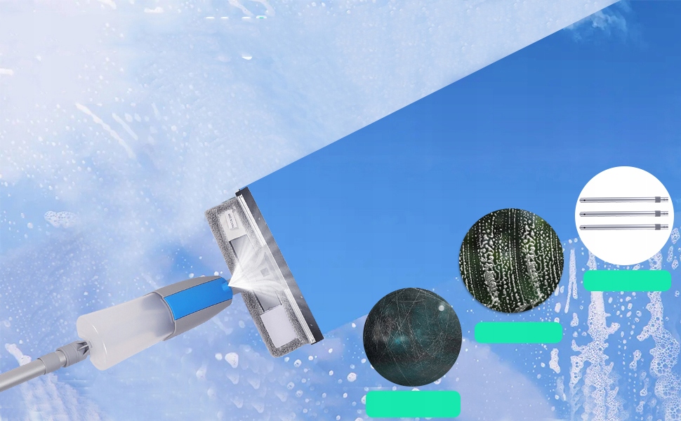 Функция распыления - на головке средства для мытья окон имеется бутылочка, в которую можно налить воду или моющее средство, нажать кнопку на ручке и распылить столько, сколько захотите. Воду или чистящую жидкость можно легко распылить на высокие окна, поэтому вы сможете лучше очистить стойкие пятна на высоких окнах, что сделает очистку окон простой и приятной.