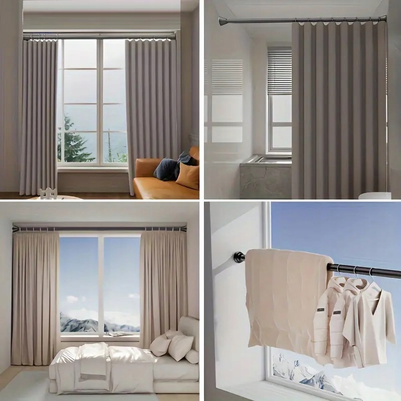 Карниз без сверления удобным и ненавязчивым способом позволяет прикрепить трубку к занавеске для душа в ванной, к шторам в гостиной, или в качестве штанги для подвешивания одежды.
