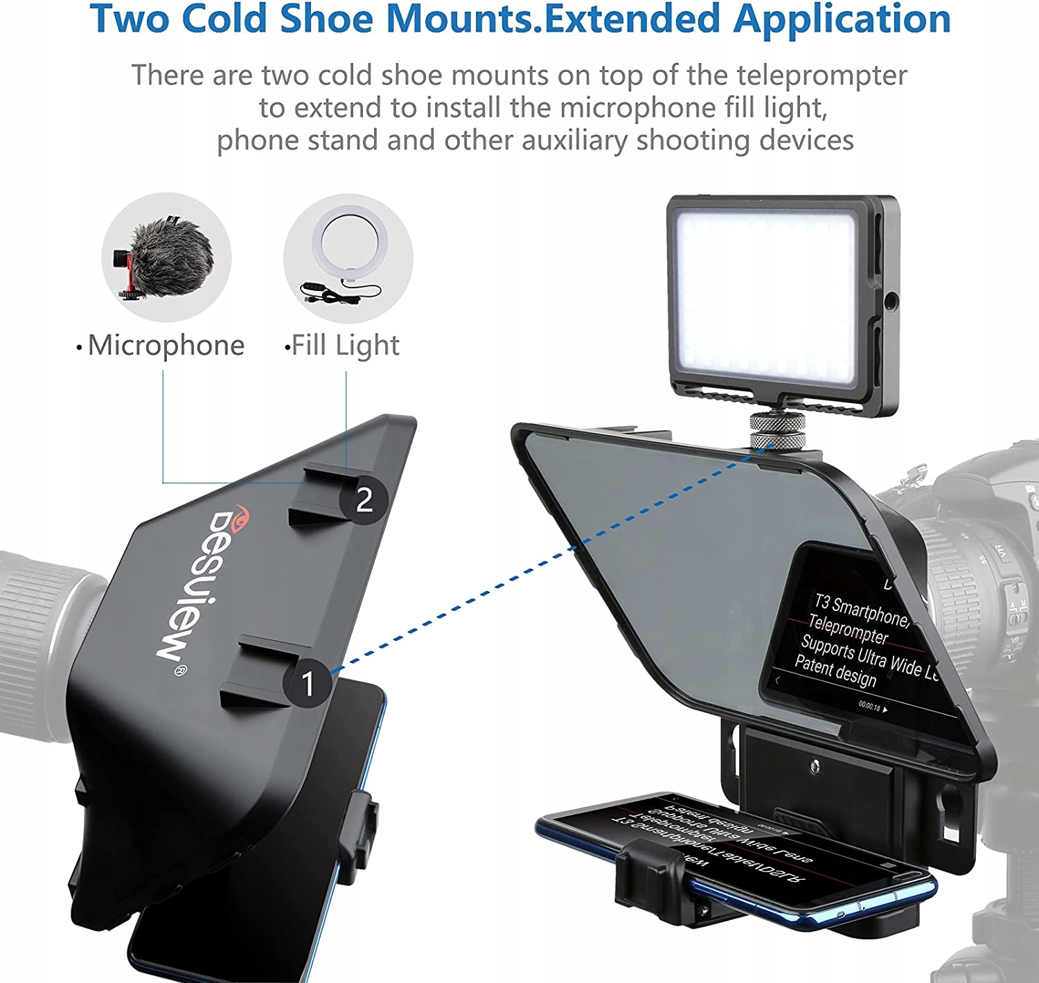 - Телесуфлер шириной 28 см: Телесуфлер Desview T3 предназначен для фотосъемки с помощью зеркальной фотокамеры, камеры или смартфона; телесуфлеры поддерживаются для iPad с диагональю до 11 дюймов, планшетов и телефонов аналогичного размера; Телесуфлер iPad оснащен двумя встроенными креплениями для холодного башмака сверху, на которые можно устанавливать заполняющие лампы и микрофоны.