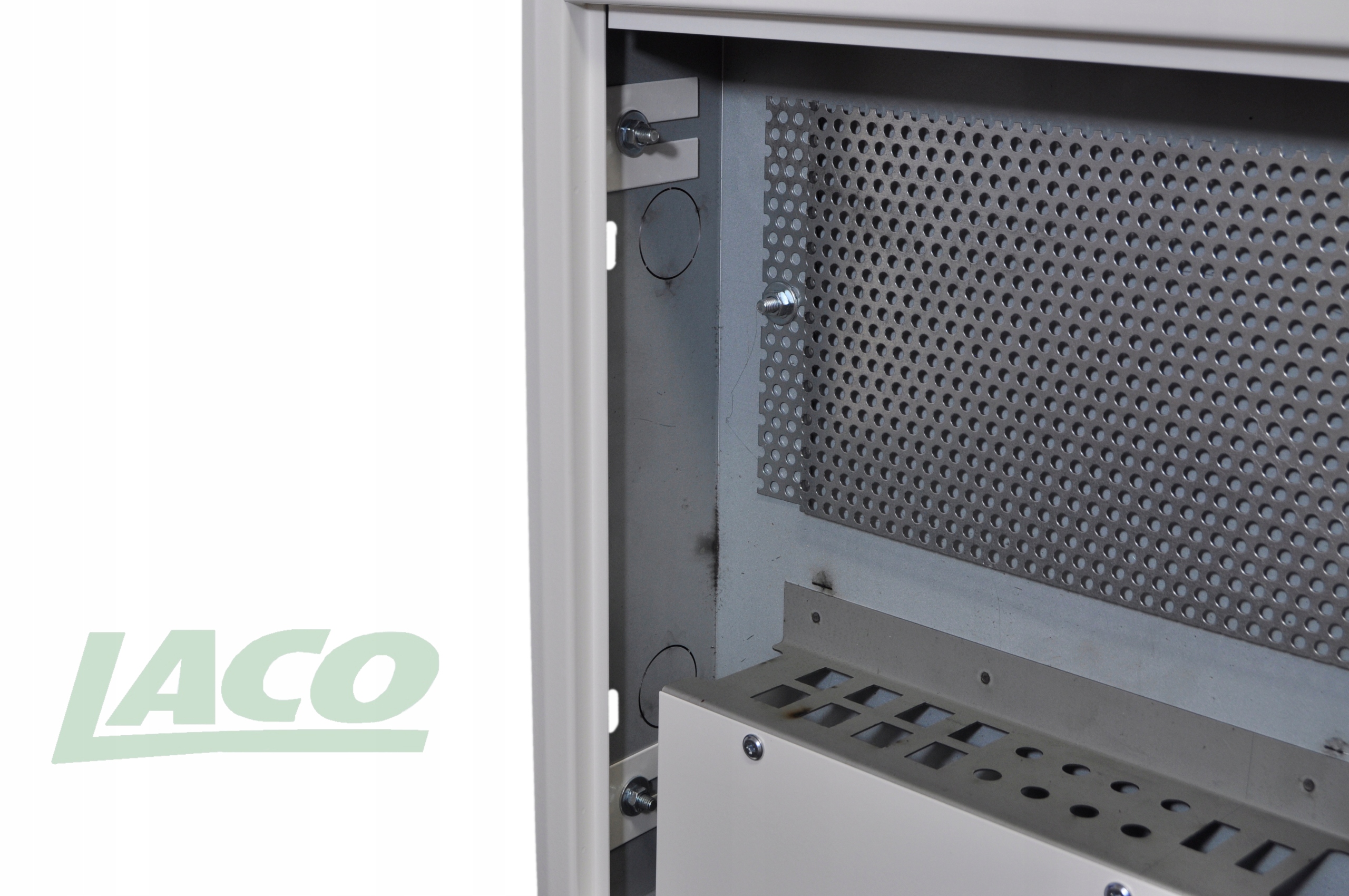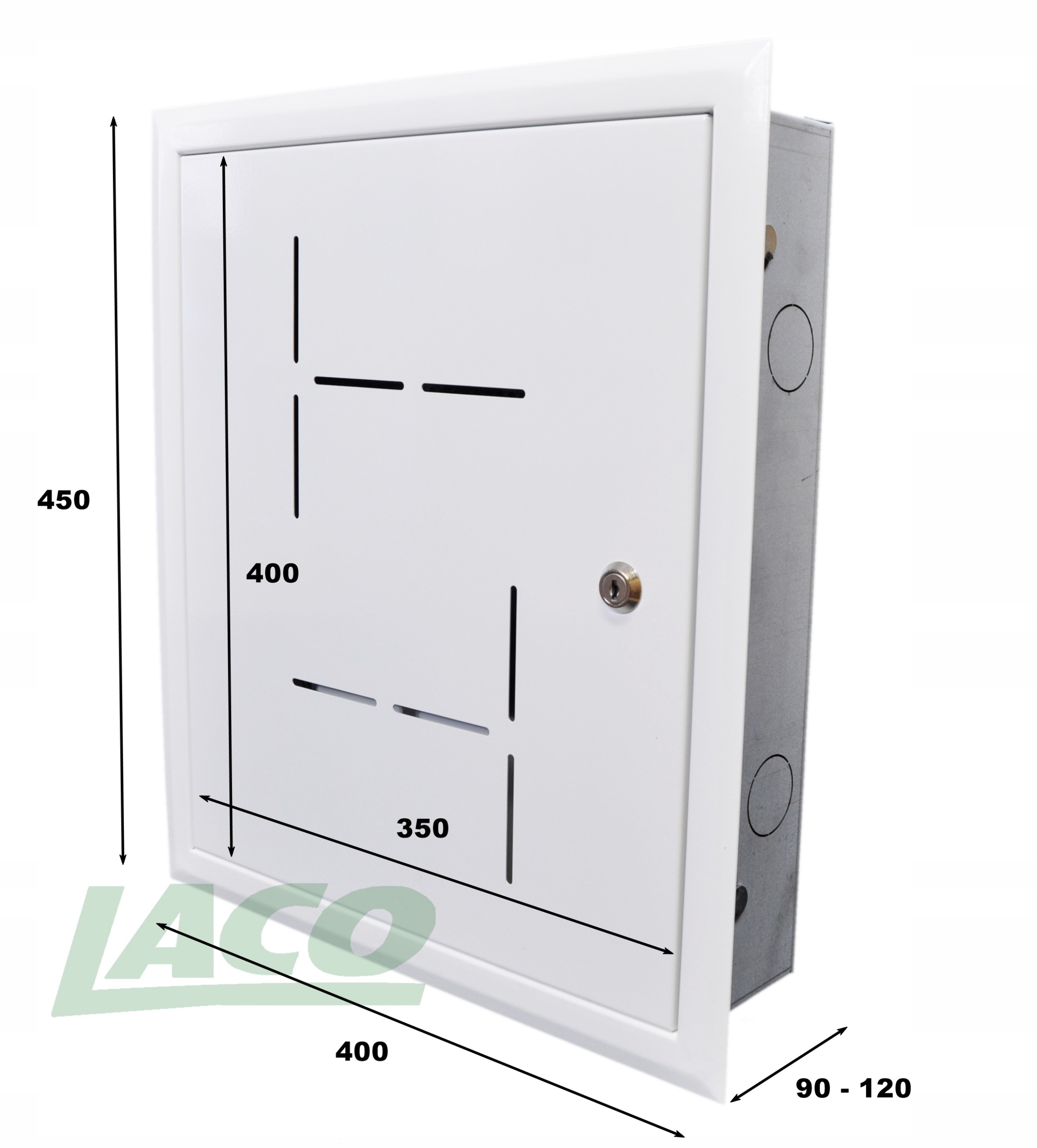 Фронтальная часть корпуса: одностворчатая, съемная дверь, закрывающаяся на цилиндровый замок с ключом. Маскирующая рамка с дверцей съемная. Это облегчает сборочные и отделочные работы, а также обеспечивает беспроблемный монтаж в отверстия глубиной от 90 до 120 мм.