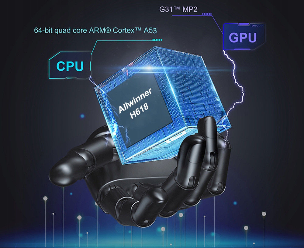 • Эффективный процессор: Allwinner H618 с четырехъядерным процессором Cortex-A53
