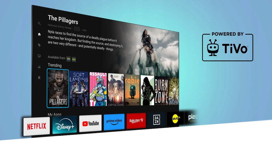 Благодаря системе SMART TV TiVo у вас есть быстрый доступ к самым популярным потоковым приложениям, таким как Netflix, YouTube, HBO MAX, Player, Disney+, Amazon Prime Video и многое другое. Это универсальный развлекательный центр у вас дома.