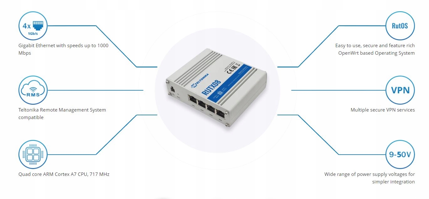 Teltonika RUTX08 — это чрезвычайно надежный и эффективный маршрутизатор Ethernet-to-Ethernet со встроенным межсетевым экраном и функцией VPN. Он использует передовую систему RutOS, основанную на технологии OpenWrt. Интерфейсы Gigabit Ethernet, прочный алюминиевый корпус и поддержка протоколов промышленных сетей делают RUTX08 идеальным устройством для профессионального применения.