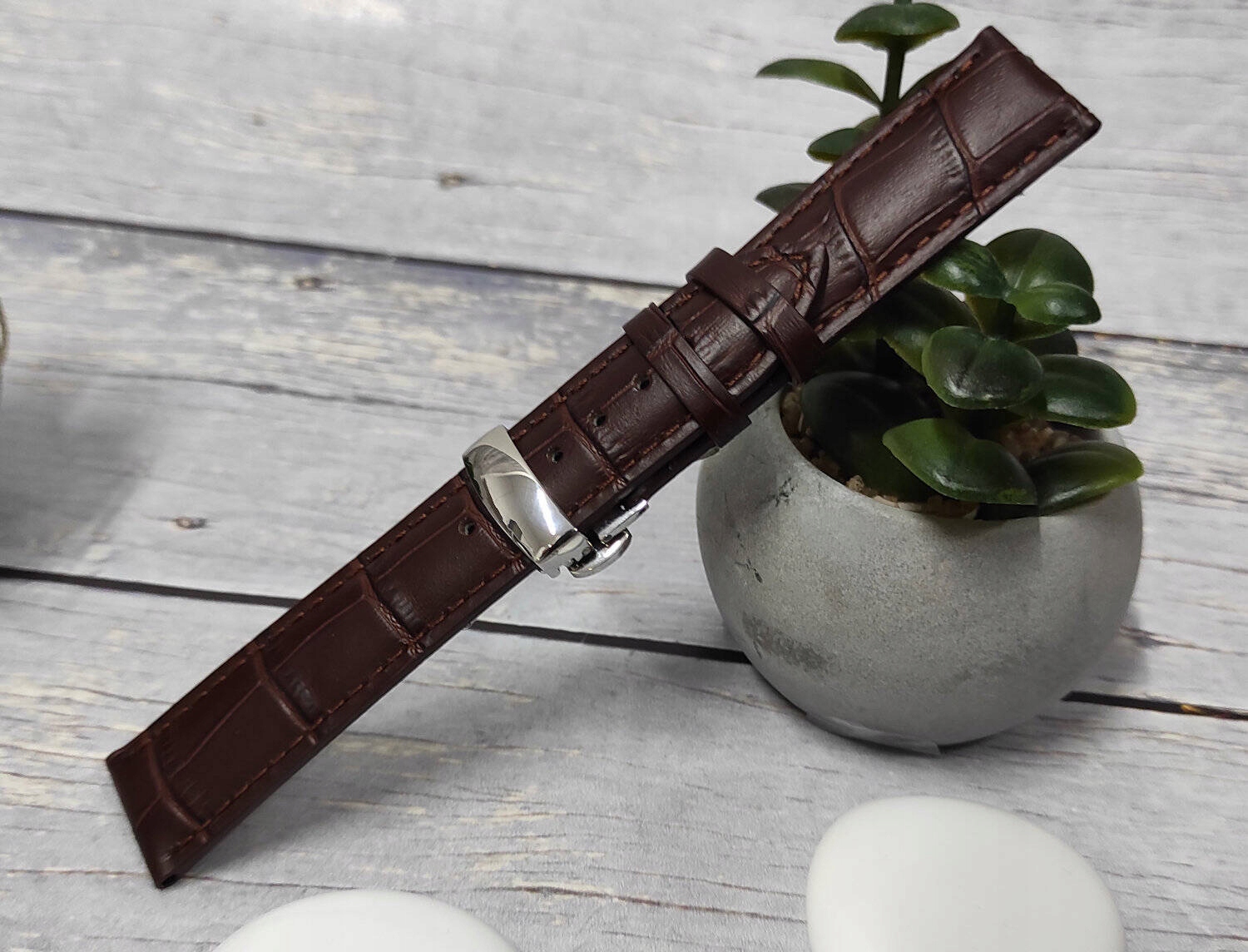 Темно-коричневая кожаная кожаная кошелька конусной конусы к часу 22 мм jvd. Ширина 22 мм. Текстура крокодила кожи. Браслет застежка. Ремешок подходит для всех часов со стандартной креплением шириной 22 мм. Телескопы бесплатно