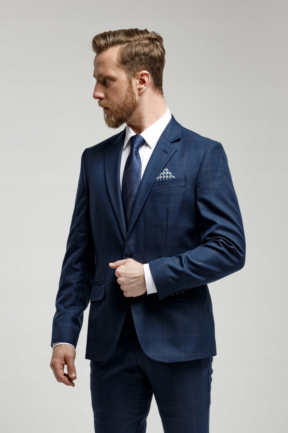 Костюм, темно-синий и коричневый в клетку, две пуговицы, SLIM, брюки на талии - VICTORIO