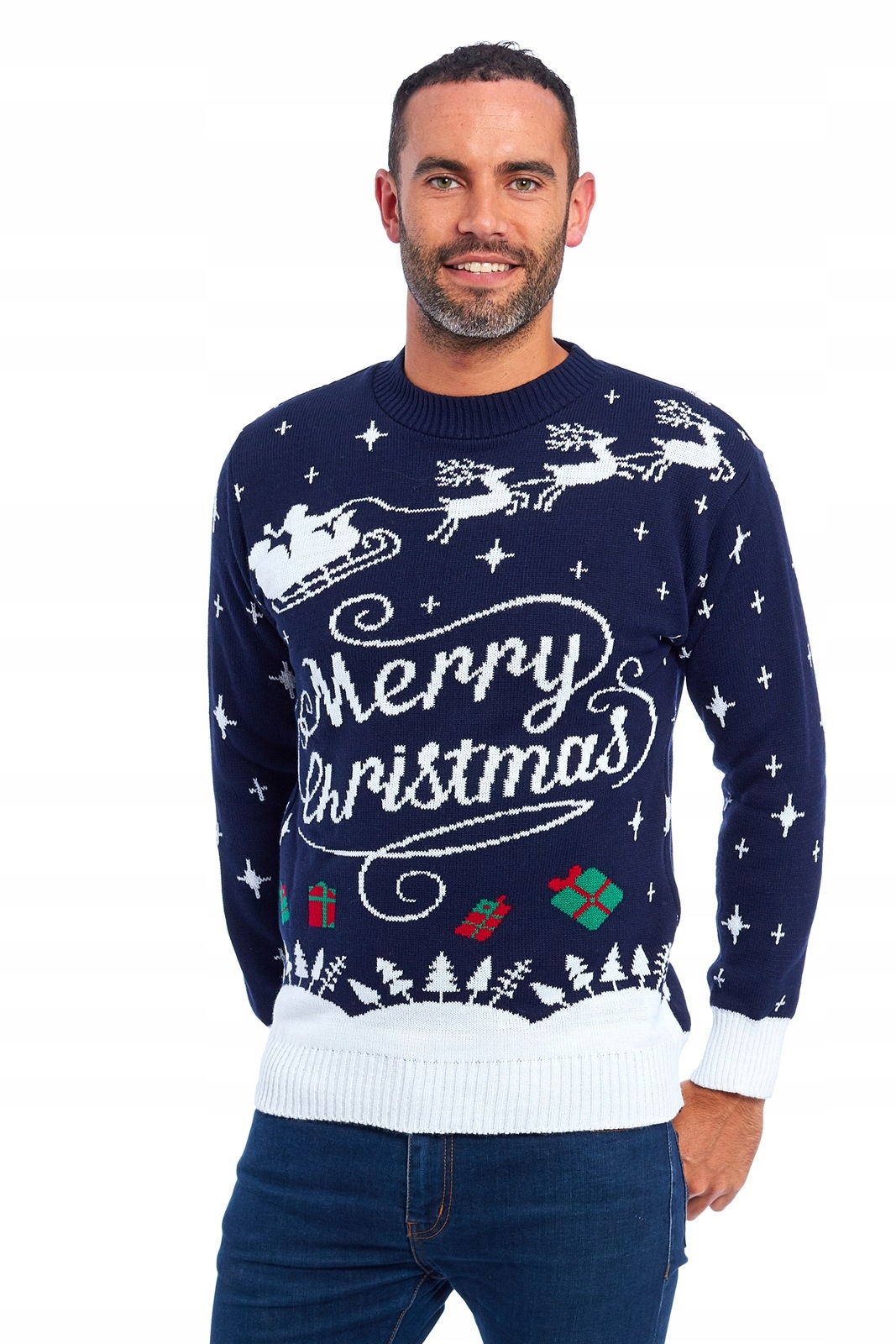 Темно-синий, классический рождественский свитера с белой надписью «С Рождеством», Дед Мороз с оленями, подарками и елками. Белые манжеты и манжета внизу свитера.