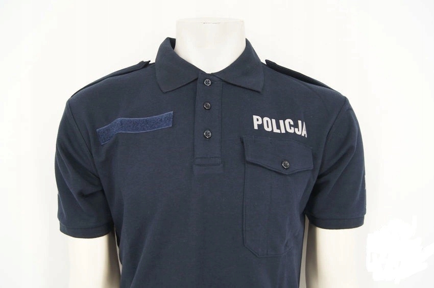 Спереди слева расположен внешний карман с клапаном, застегивающимся на пуговицу. На спине, над клапаном кармана и на обоих рукавах серебряная надпись «ПОЛИЦИЯ». Карман на левой груди и лямках. Светоотражающие надписи POLICJA, выполненные методом термопечати на рукавах, на левой груди и на спине рубашки-поло. Футболка не деформируется и не обесцвечивается даже после многократной стирки. Состав: