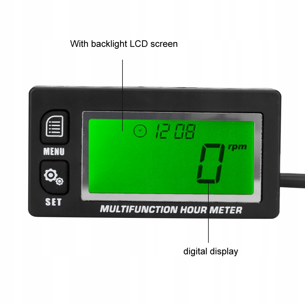 Система измерения температуры включает в себя: измерение текущей температуры, максимальной температуры и функции предупреждения с превышением температуры, отображение температурного блока может быть установлено пользователем, тип датчика температуры может быть выбран пользователем и т. Д. Двигатель, запись и просмотр максимальной скорости двигателя и установки функции предупреждения со скоростью, превышающей скорость, частота платежного платежного питания. Замена, зеленая подсветка, большой ЖК-дисплей, водостойкость IP65 и т. Д.