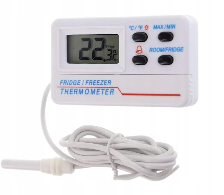 Термометр с ЖК-панелью можно использовать, например, для измерения температуры. холодильники, холодильные камеры и т. д. Имеет щуп на кабеле длиной 120 см. Термометр имеет функцию сигнализации, информирующую о слишком низкой или слишком высокой температуре. Температуру сигнализации можно свободно настроить.