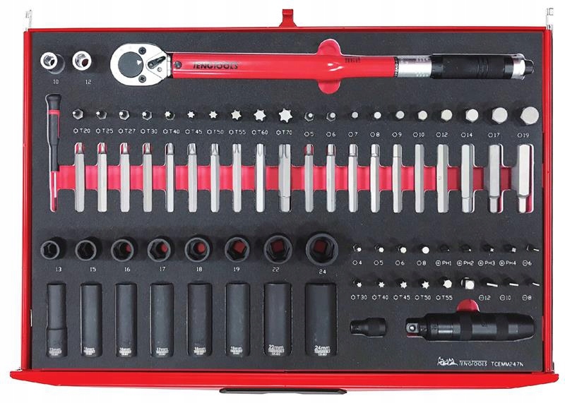 247-элементный инструмент, набор в троллейбусе инструмента TCW807N TCW807N в оригинальном цвете TengTools. Все инструменты организованы в точно вырезанных модулях пены EVA с высокой плотностью в трех цветах, благодаря которому легко увидеть инструменты, которых нет на месте.
