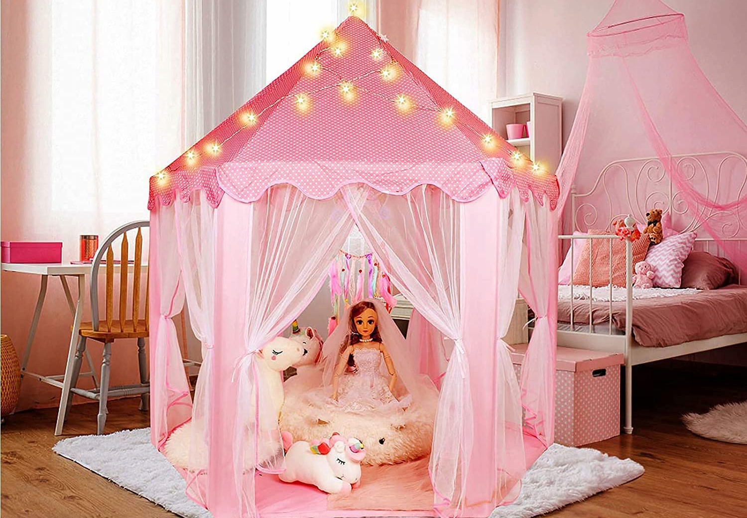 Эта качественная палатка в форме дворца принцессы не только восхищает своими >очаровательный внешний вид, но и создает незабываемое место для беззаботного веселья. Благодаря своей прочной конструкции с конюшней Каркас и прочный материал обеспечивают безопасное пространство для творческих приключений.