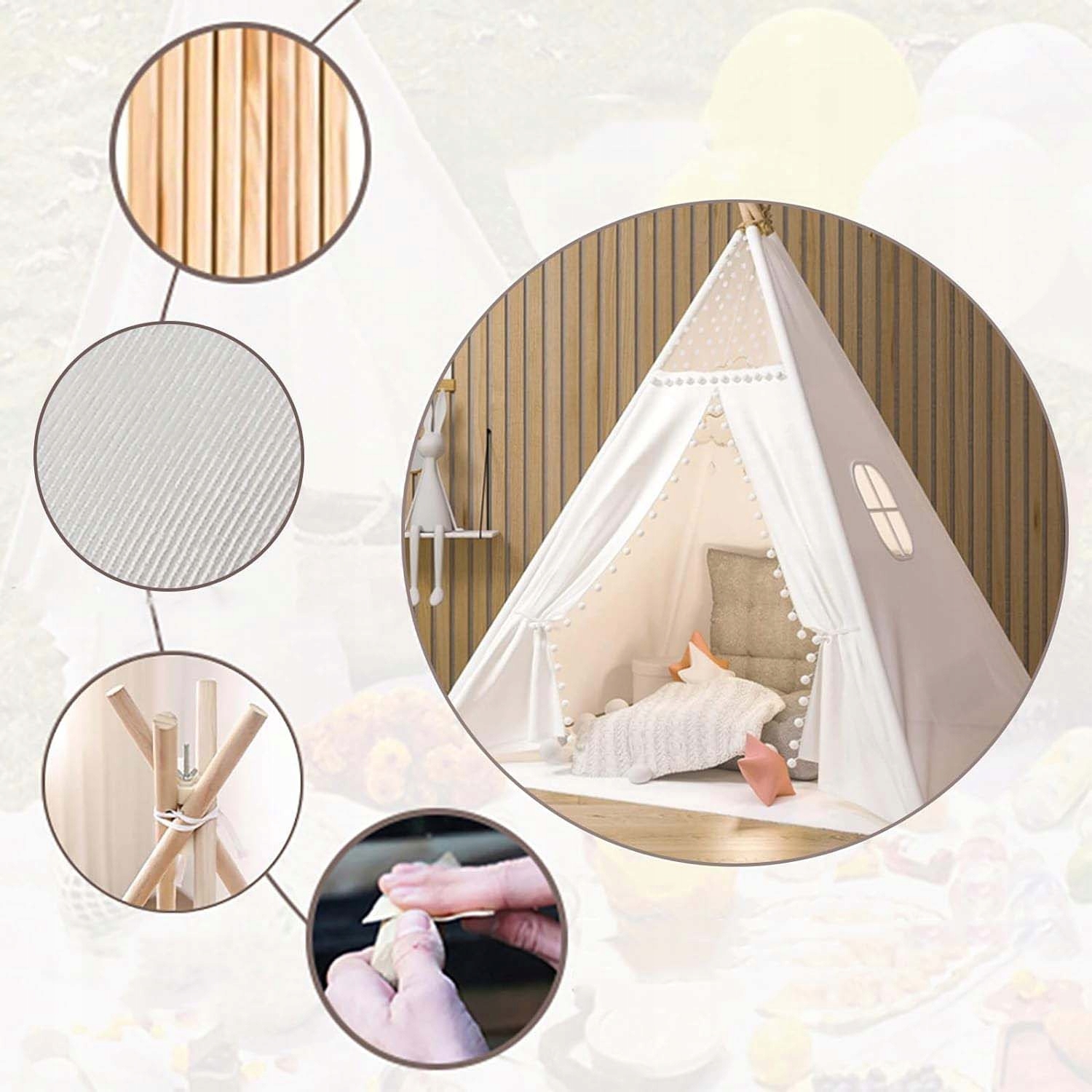 ✅【Безопасно и весело】 Эта детская палатка-вигвам оснащена опорами из натурального дерева и пластиковыми соединителями, чтобы выдержать любопытную игру любого ребенка. Все швы, необработанные края ткани и отверстия обеспечивают долговечность и прочность, которые могут обеспечить безопасность вашего ребенка и прослужат долгие годы безопасной игры. Деревянные столбы шлифуются, чтобы предотвратить растрескивание. Откидная дверь и сетчатое окно облегчают вентиляцию. Палатка принцессы — лучшая игрушка для маленьких девочек/мальчиков.