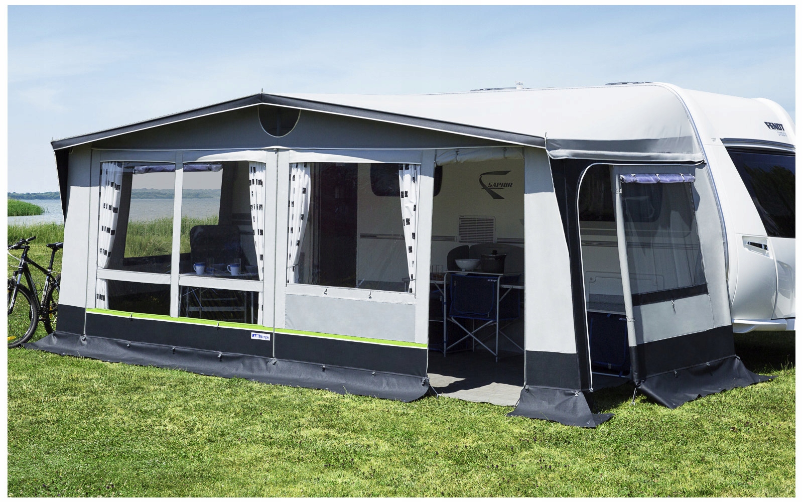 Всесезонный вестибюль Palermo II от Berger для караванов обеспечивает дополнительное пространство и защищает конфиденциальность. Он изготовлен из высококачественных материалов и устойчив к погодным условиям. Он имеет большие окна, обеспечивающие много света внутри. Боковые окна оборудованы противомоскитными сетками. Для установки тамбура достаточно задвинуть прицеп в прицеп.