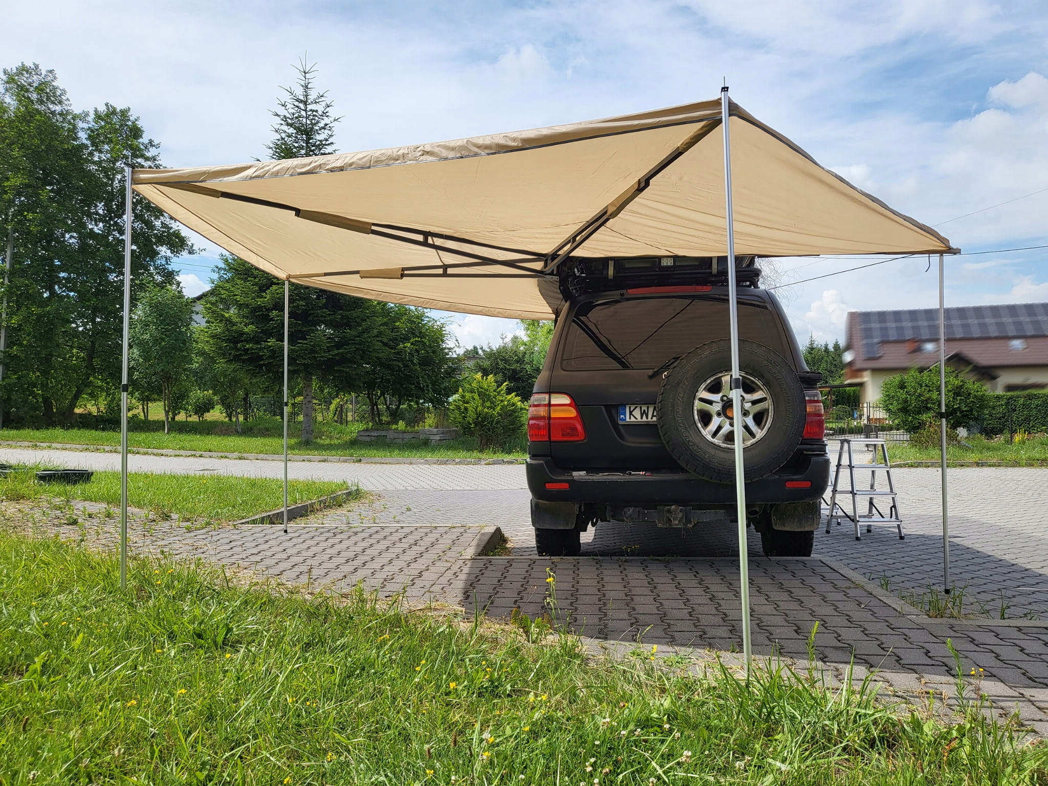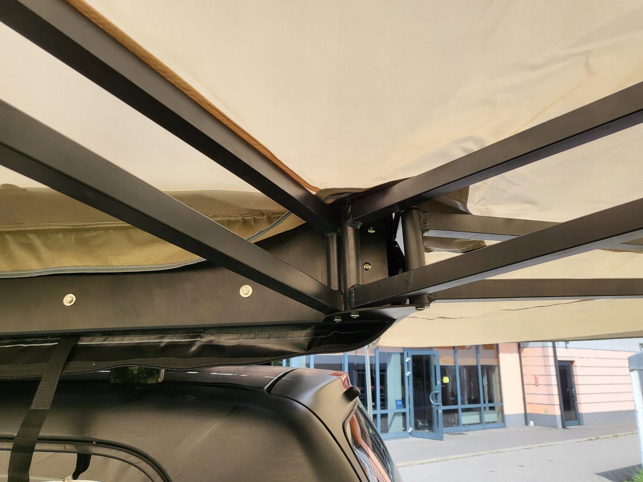 Длина вдоль автомобиля - 2 метра. шарнирные и толстые профили заставляют его сложить и сложить крышу даже в одиночку. Регулировка высоты.