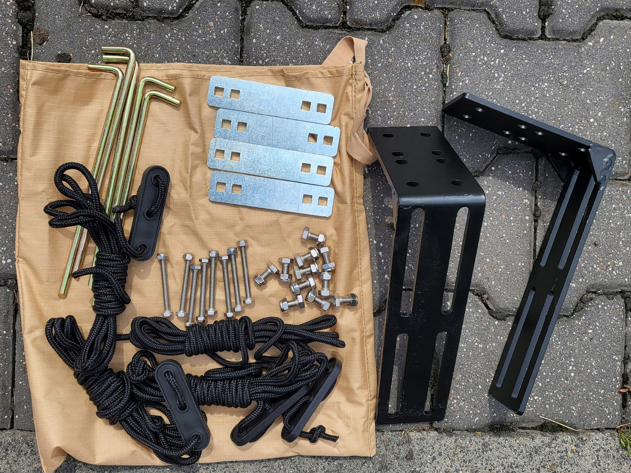 включает в себя две очень жесткие крепления, набор винтов, прорезь, высокие каблуки, 4 телескопические стержни с регулируемой высотой.