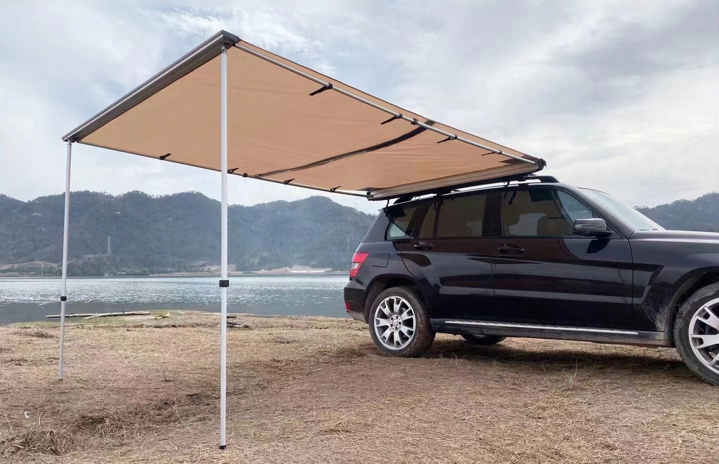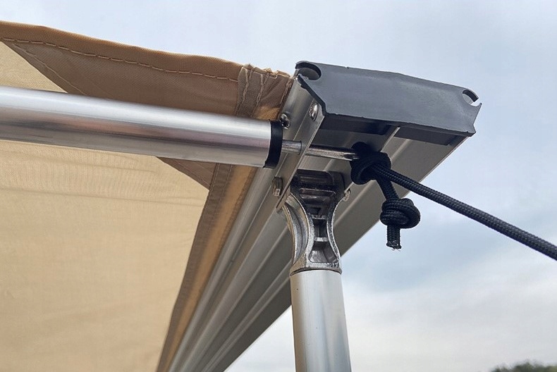 Тент прикрепляется к автомобилю с помощью прилагаемых кронштейнов. Свернутый в компактный рулон он не занимает много места на крыше и не нарушает аэродинамические свойства автомобиля. Раскладывание и складывание маркизы происходит быстро и не требует особых усилий.