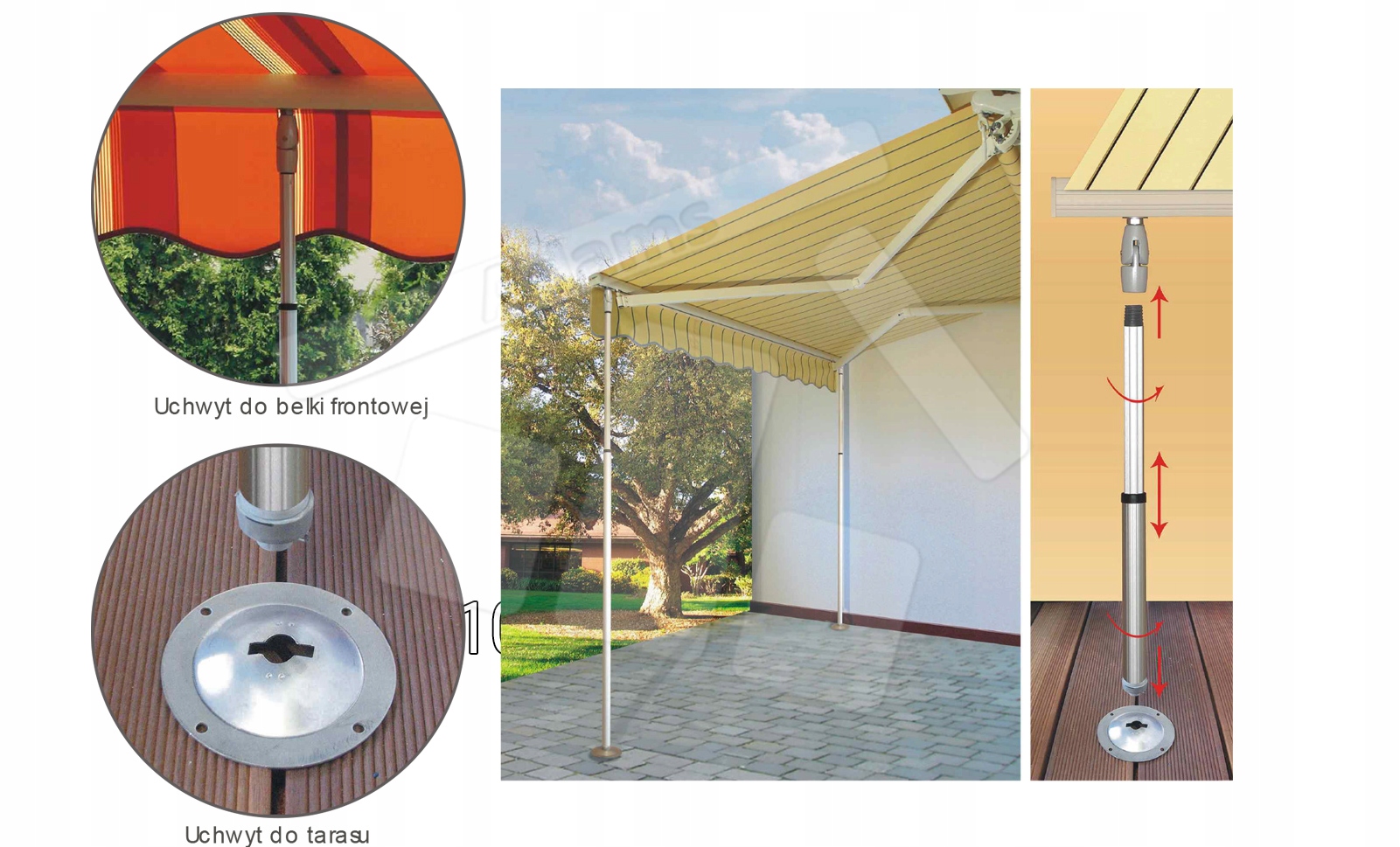 За дополнительную плату тент может быть оснащен ветрозащитными опорами. Быстрая сборка и разборка. Регулируемая высота от 150 до 250 см. Они позволяют использовать тент в ветреную погоду. Не рекомендуется для маркиз с электроприводом. Не следует использовать для маркиз с датчиком ветра.