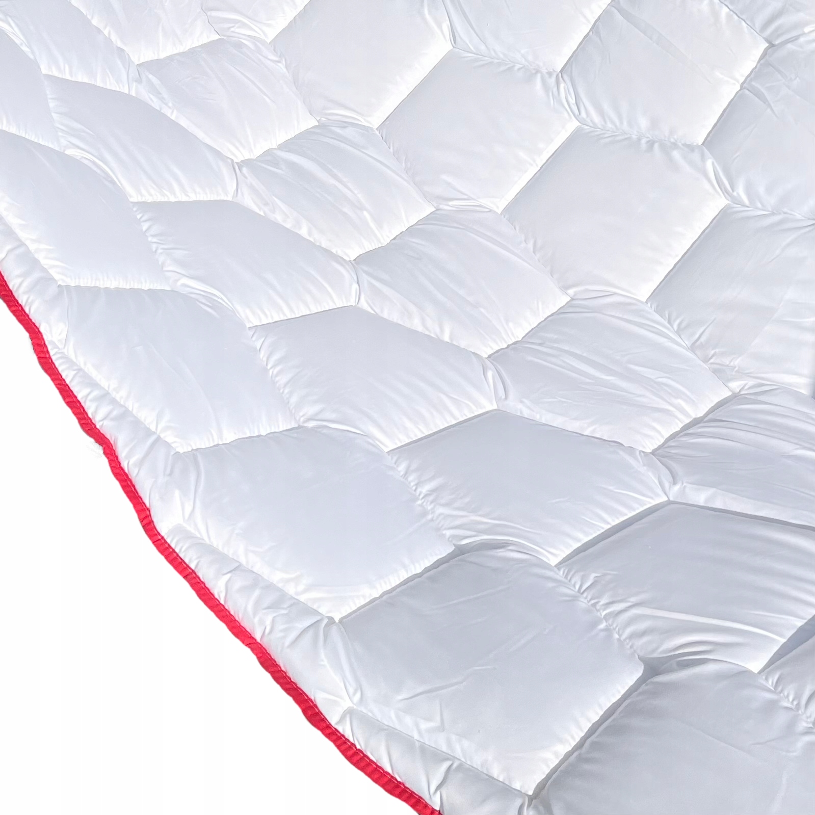 Атласная отделка красного цвета подчеркивает теплый характер одеяла.