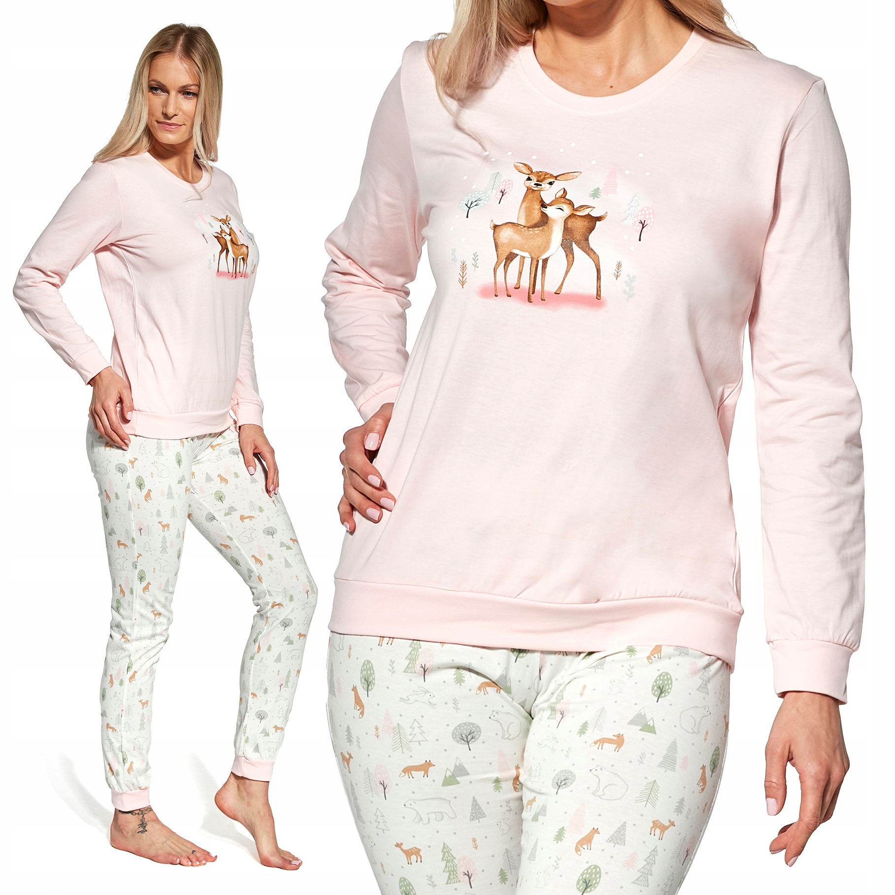 В пижамный комплект Cornette Fall входит розовая пижамная блузка с принтом и белыми, длинными брюкамис лесным мотивом.