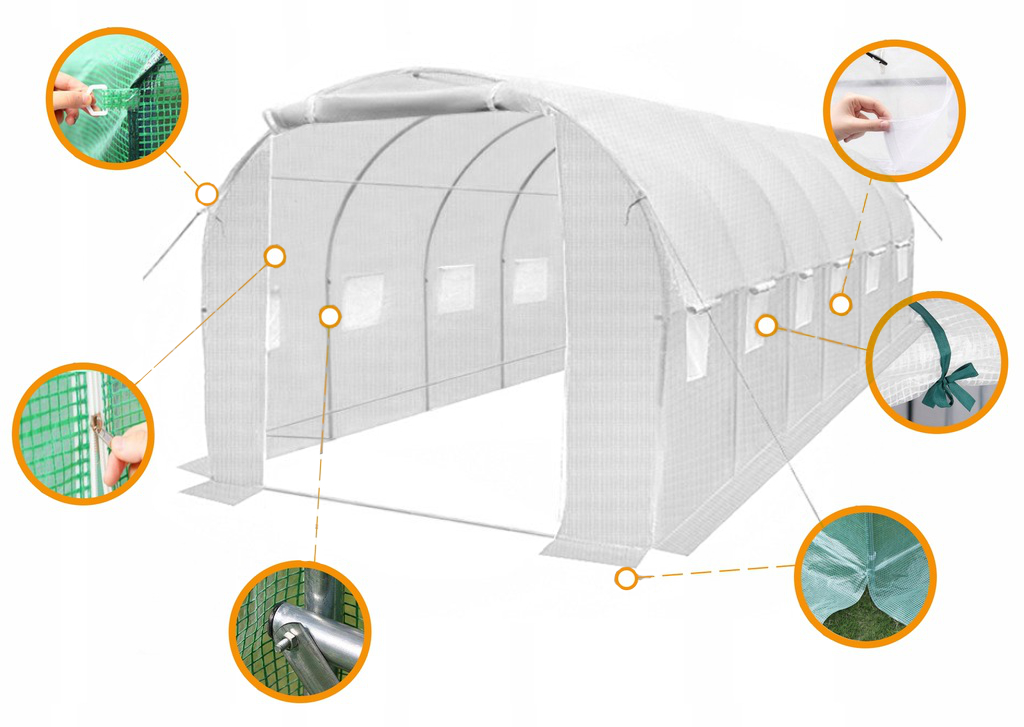 Туннель изготовлен из полиэтиленовой пленки с фильтром UV-4, что делает его исключительно устойчивым к погодным условиям и прекрасно изолирует сельскохозяйственные культуры. Это позволяет продлить вегетационный период растений благодаря идеальному микроклимату. Это дает возможность выращивать теплолюбивые растения, такие как огурцы, перец, томаты, баклажаны и т. д., а также позволяет ускорить выращивание капусты, листовых овощей, декоративных растений и получение рассады. Конструкция нашего фольгированного туннеля изготовлена из оцинкованных стальных профилей, она очень прочная, стабильная и устойчивая к коррозии. Вентиляция обеспечивается окнами с москитными сетками, что дополнительно защищает посевы от насекомых.