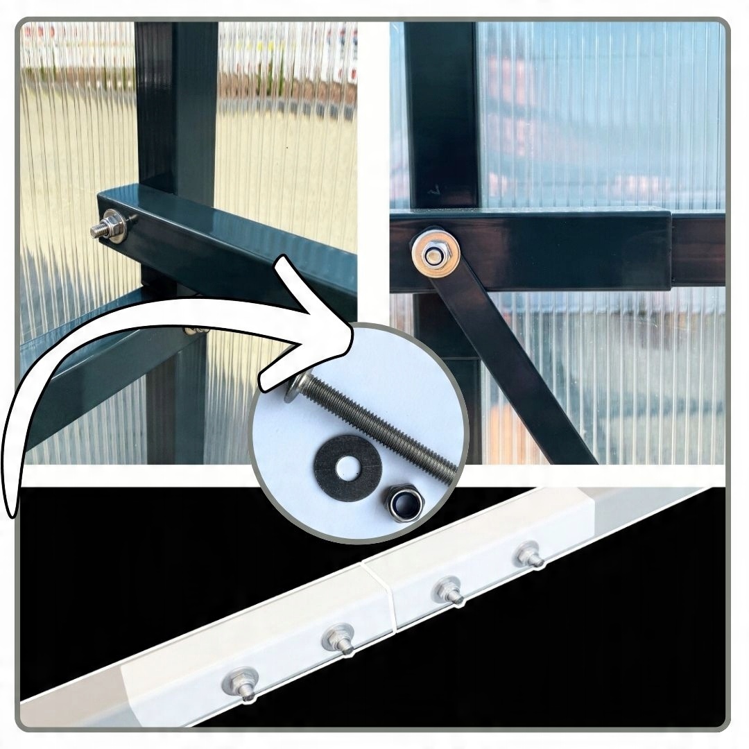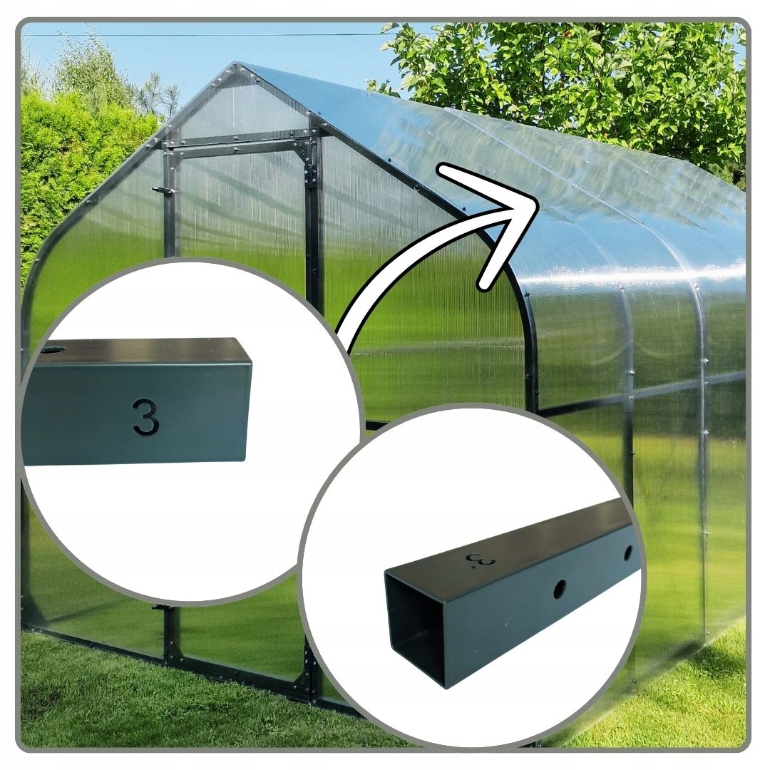Кроме того, каждый профиль имеет лазерные отверстия для шурупов конструкции и шурупы для крепления поликарбоната, благодаря чему окончательная сборка теплицы происходит значительно быстрее. Лазерные отверстия, расположенные через равные промежутки времени, добавляют общей эстетики. Все профили подробно описаны, что делает установку простой и интуитивно понятной. Производство и покраска профилей происходит в Польше.