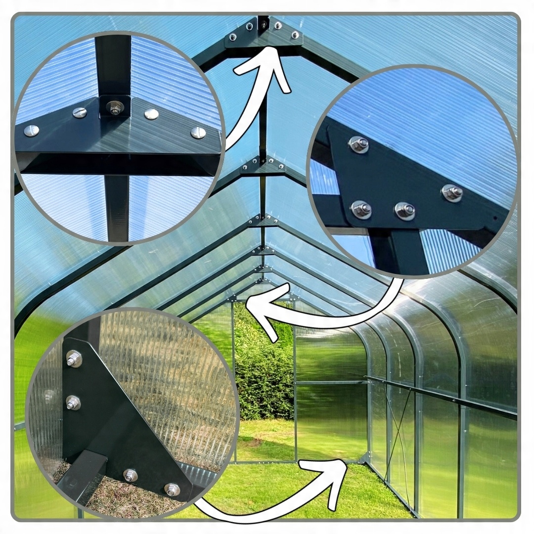 Очень хороший визуальный эффект теплицы достигнут благодаря окрашенным профилям, эстетичным шурупам и инновационный метод соединения конструкции и поликарбонат высочайшего качества, который полностью соединяет каркас, создавая красивую форму теплицы. Весь продукт производится в Польше, компоненты также производятся в Польше. Благодаря этому мы можем гарантировать высокое качество продукта.