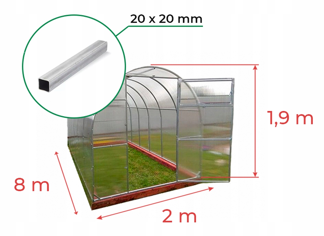 ТЕПЛИЦЯ ПОЛІКАРБОНАТНА 6мм - 2х8м з ОЦИНКУВАННЯМ 20х20мм