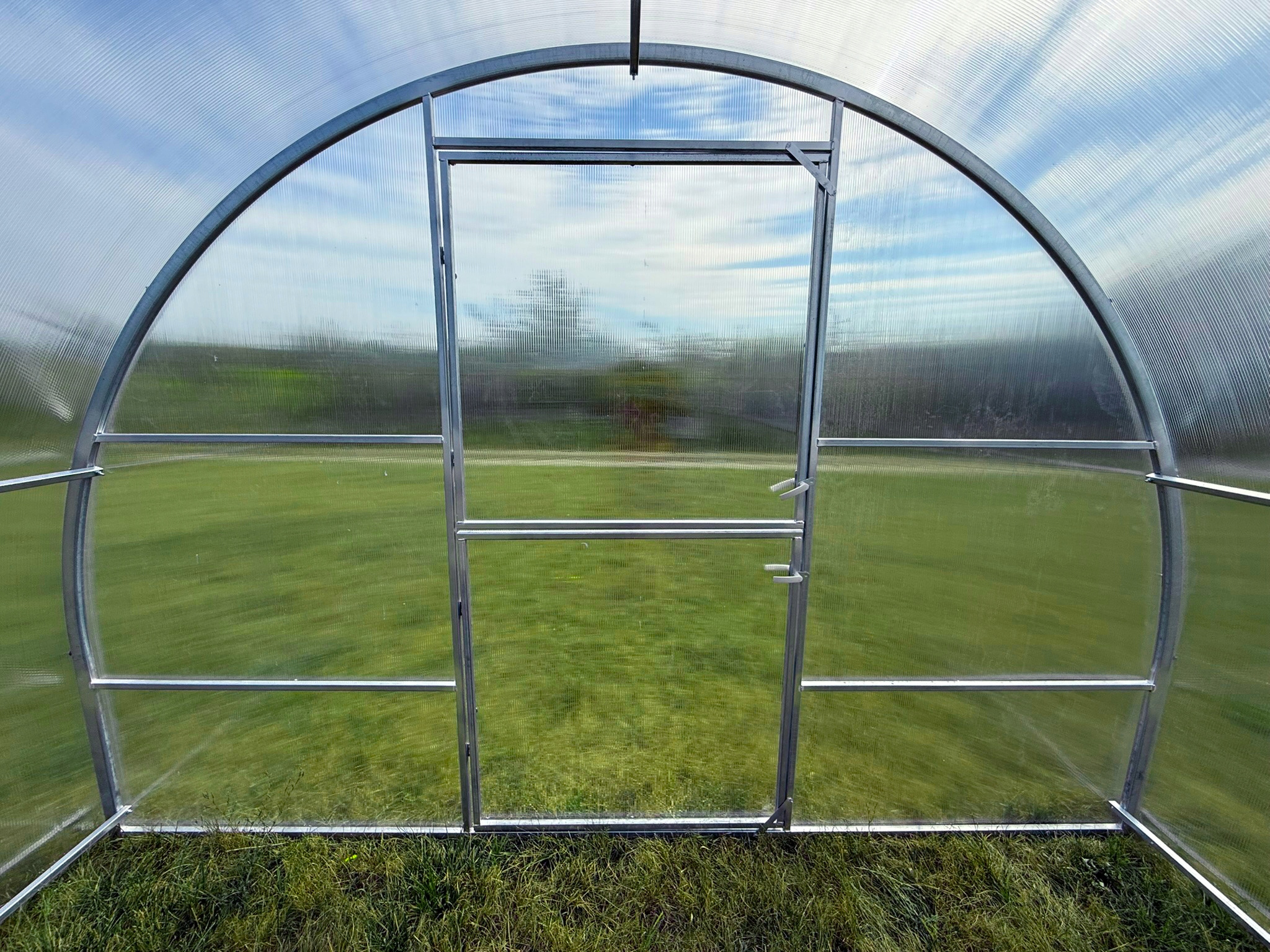 Теплица имеет две двери с каждой стороны. В дверях теплицы уже установлены окна.