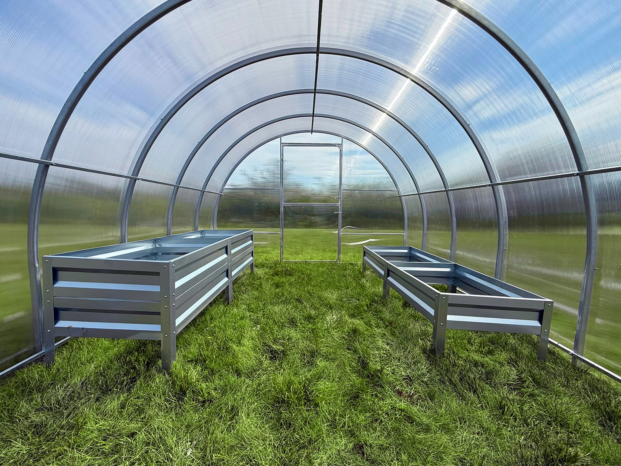 Теплица имеет две двери с каждой стороны. В дверях теплицы уже установлены окна.
