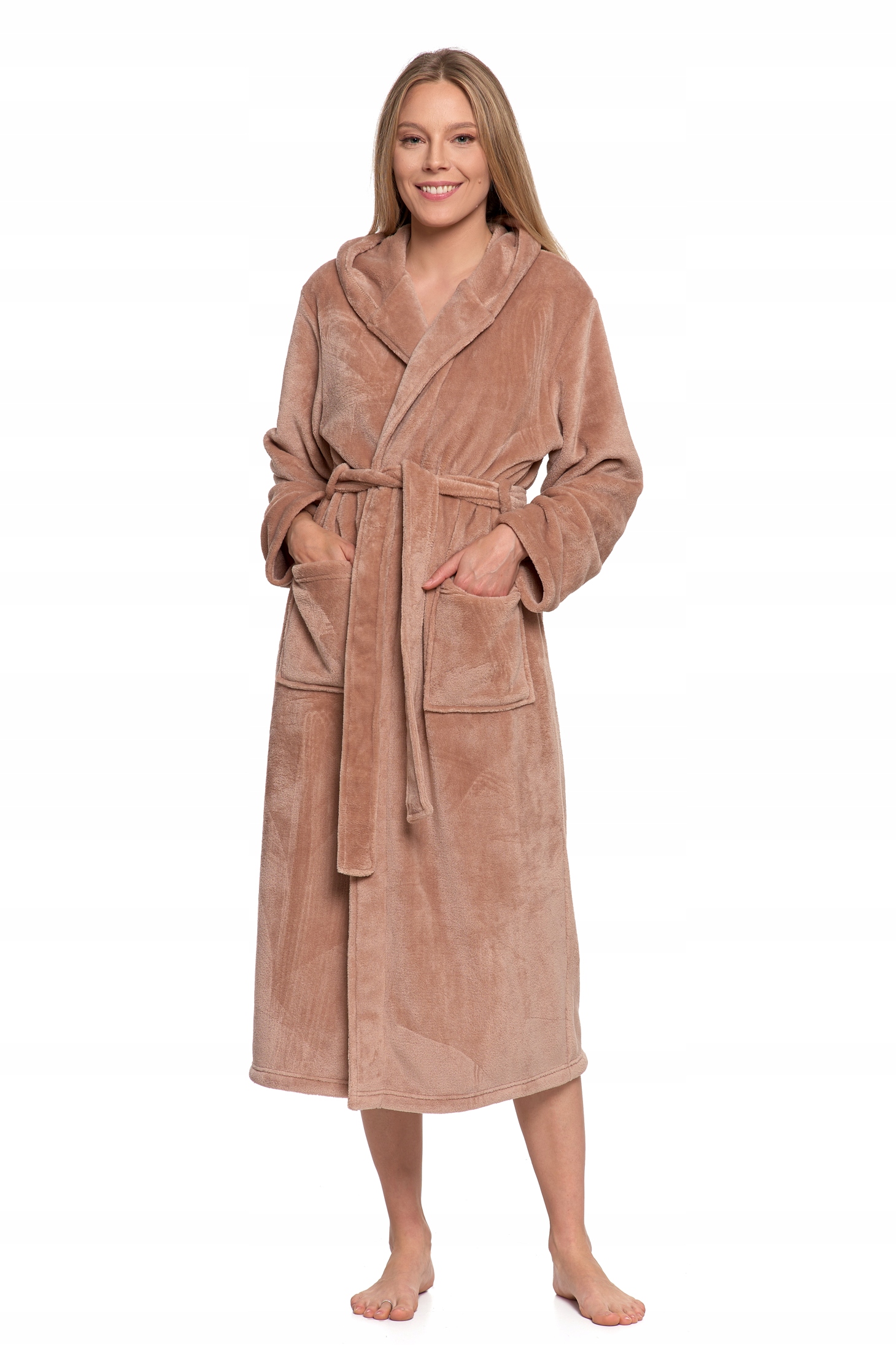 Длинный женский халат с капюшоном, мягкий плюш, бежевый MORAJ M💛