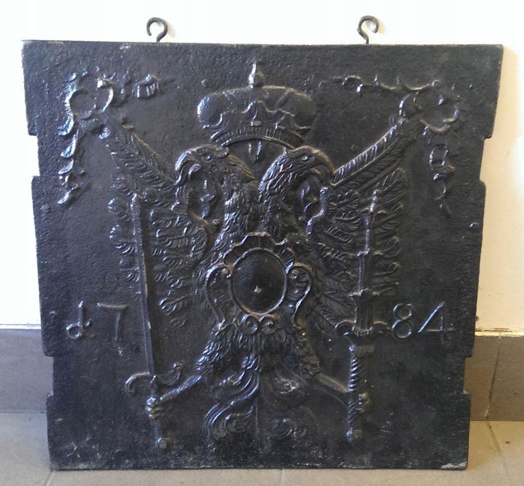 Акумулирующая тепло в открытом камине тарелка с императорским двуглавым орлом, знаками власти и датой 1784 года. Материал: чугун. Размеры 55 см х 54,5 см, с ручками 55 см х 57 см, вес 22 кг. Доску также можно использовать как подвесную табличку. Было бы неплохо закрепить ее, закрепив снизу из-за большого веса доски.