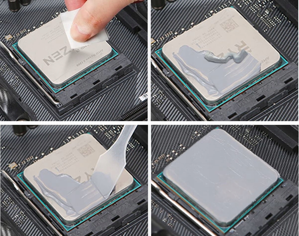 ✅ Термопаста — пластичная масса, характеризующаяся сравнительно высокой теплопроводностью. Его обычно используют в электронике, в местах соприкосновения элементов, сильно нагревающихся, и элементов, рассеивающих тепло. Тонкий слой пасты, нанесенный на охлаждаемую систему (CPU, GPU, северный мост, ОЗУ), заполняет микронеровности поверхности в месте контакта с радиатором и увеличивает поверхность теплопроводности, генерируемую системой.