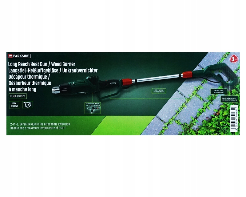 Тепловая пушка и горелка для сорняков PARKSIDE® 2-в-1 — универсальное устройство для удаления, формирования и нагрева различных материалов, а также для экологически чистого уничтожения сорняков без использования химикатов. Устройство имеет мощность 2000 Вт и три регулируемых уровня температуры: 100, 350 и 650°С. Их можно использовать как тепловую пушку или сжигатель сорняков благодаря встроенной удлинительной ручке.