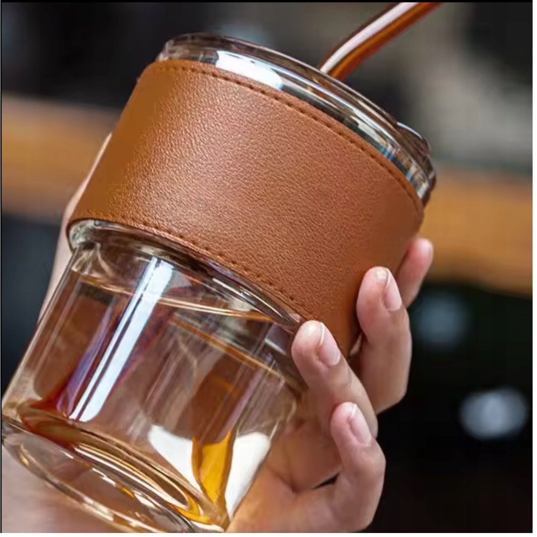 тепловое стекло с искусственной кожаной ручкой, крышкой и стеклянной соломой - емкостью 400 мл h2>