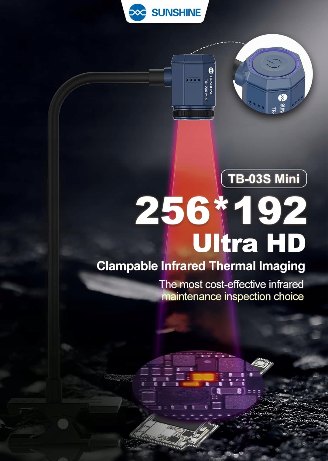 Sunshine TS-03 Mini-это инфракрасная камера с тепловой визуализацией , специально разработанная для обнаружения горячих тепловых точек на мелких печатных плитках.