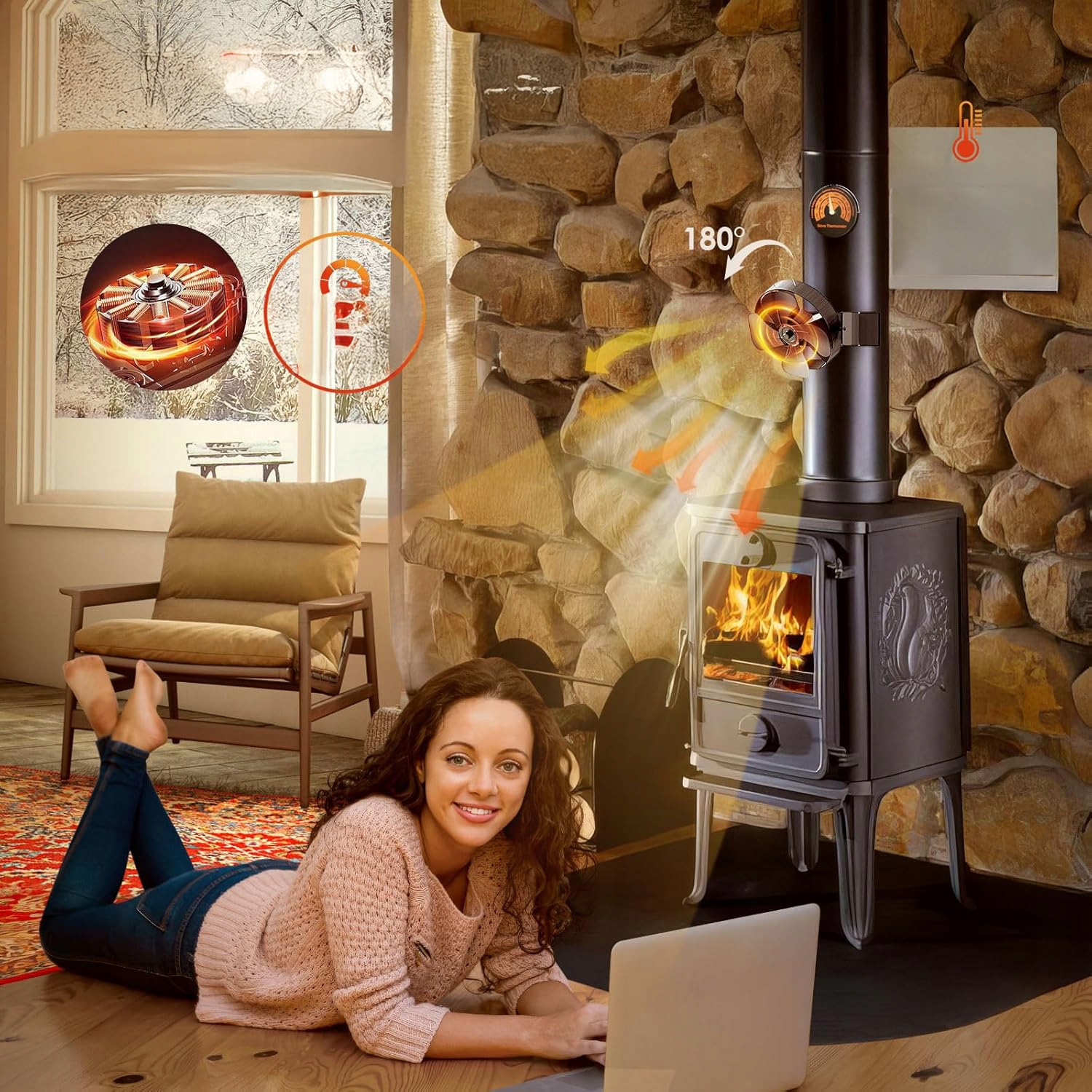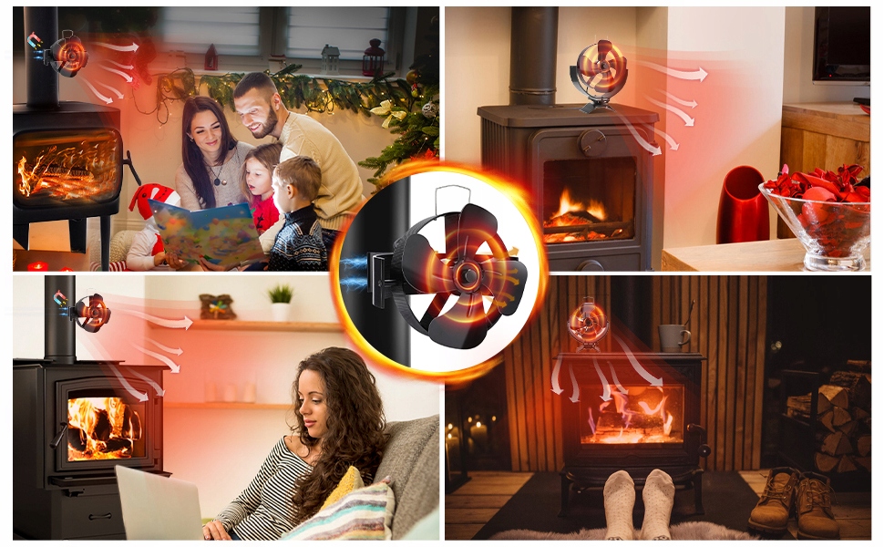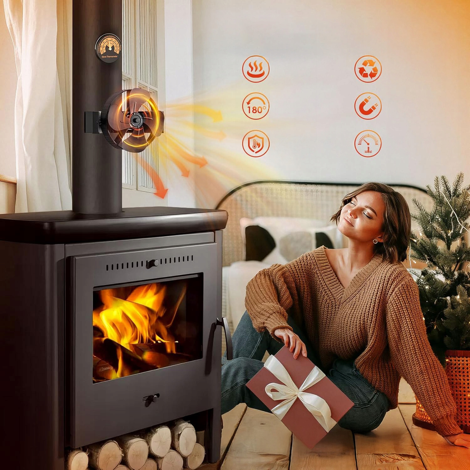 ♨️ ♨️Каминный вентилятор без электричества: Каминный вентилятор питается от тепла дровяной печи, термолопасти поглощают тепловую энергию для работы. Когда температура достигает 50°С, начинает работать вентилятор камина, направляя теплый воздух горизонтально по дому.