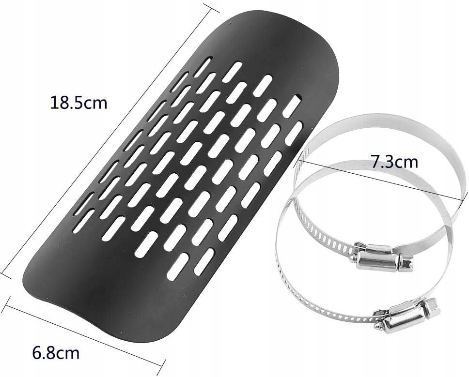 Тепловой щит выхлопного глушителя с 2 регулируемыми монтажными зажидками. Вы можете регулировать степень стеснения по мере необходимости. Размеры теплового покрова (длина x ширина): 18,5 х 6,8 см