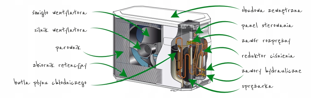 Этот модуль монтируется снаружи здания. Он состоит из вентилятора, компрессора, испарителя и расширительного клапана.