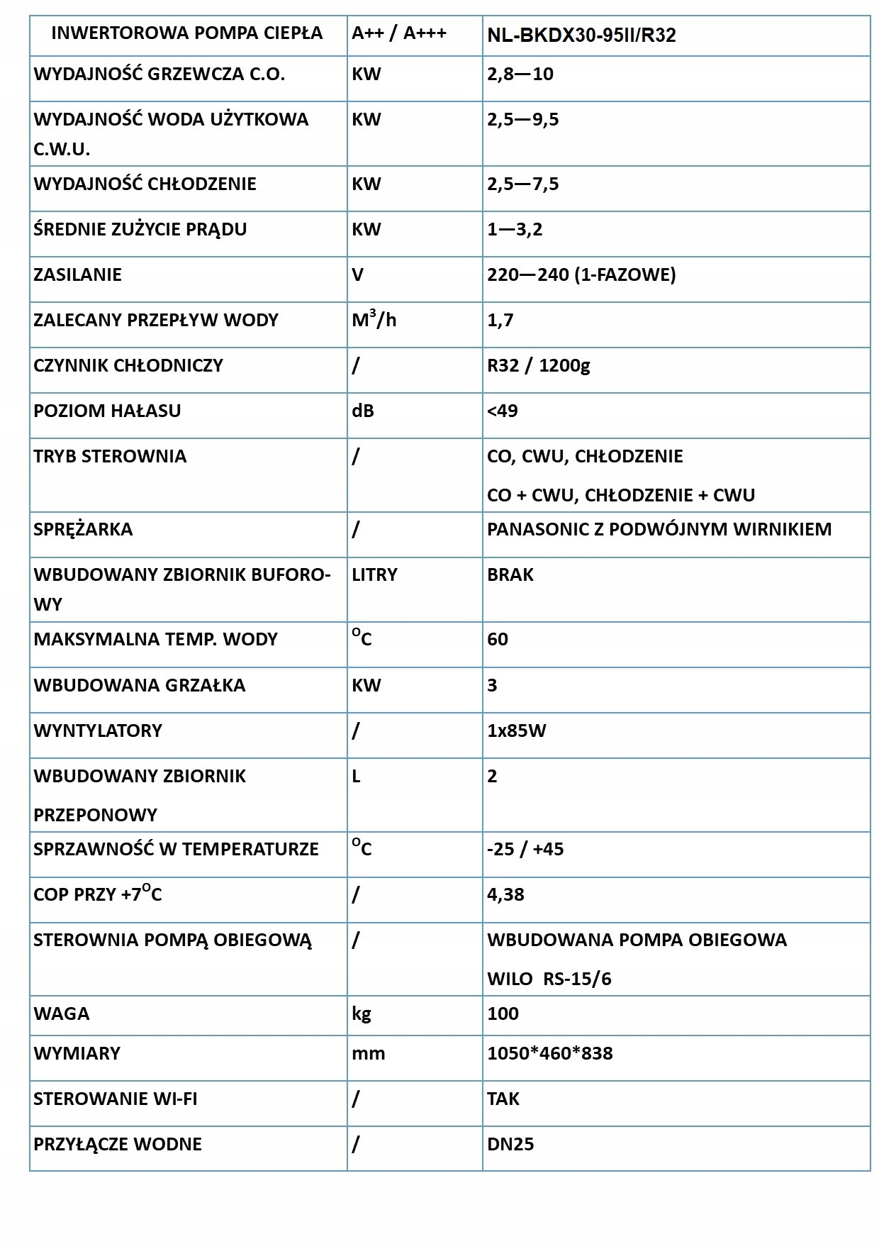 Встроенный циркуляционный насос Wilo RS-25/6, расширительный бак на 2 л, дополнительный нагреватель мощностью 3 кВт, подогреваемый поддон для сбора капель, бесщеточный двигатель вентилятора, фирменная электроника и безопасность schneider.